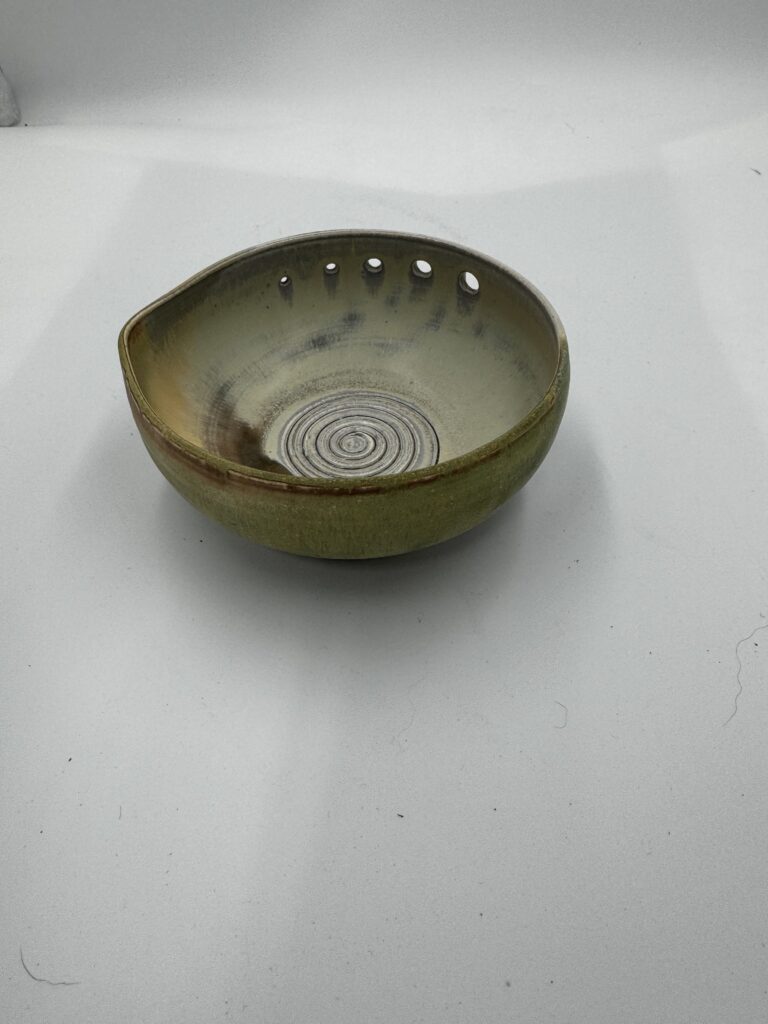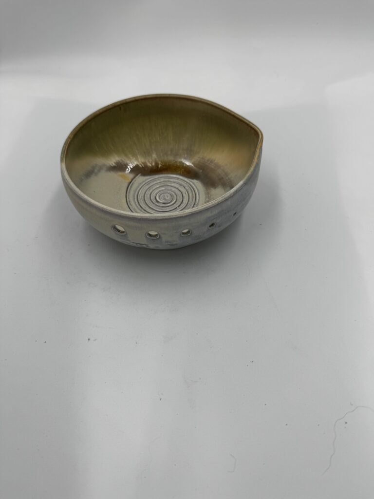 Featured is our new bowl with holes for removing leaves from the stems of your favorite herbs. In the center of the bowl, a textured spiral pattern serves as a way to grate cloves of garlic.